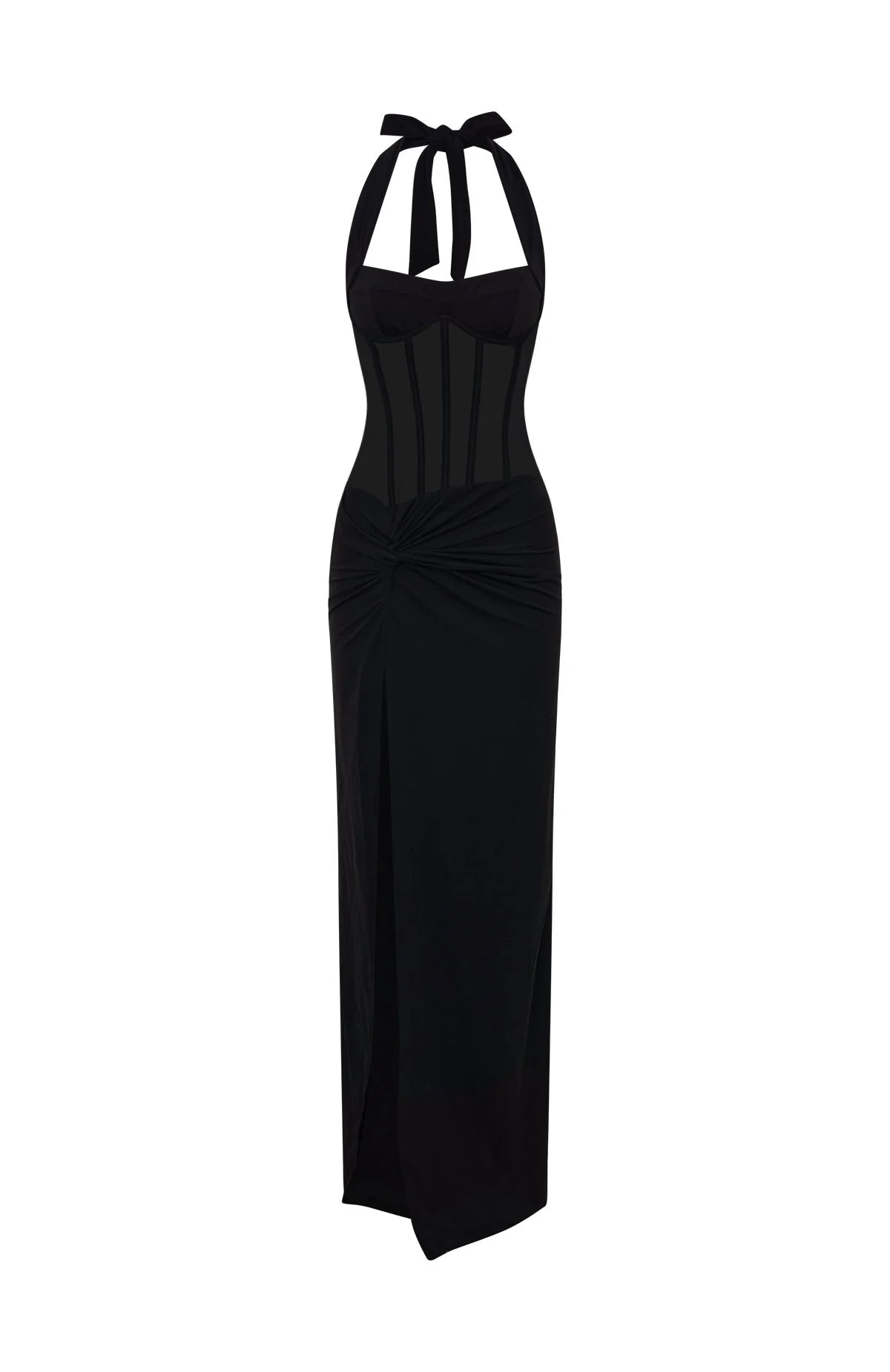 Flirty, fitted, and fabulous! The Champagne Promises Maxi Dress in Black features thick halter straps and a scoop neckline with under‑wire for lift, while internal boning sculpts the bodice. The sheer panel at the bodice adds a touch of daring, balanced by a twist knot at the front of the skirt and a front leg slit. Style with clear heels, layered gold jewellery and a top-handle bag for the perfect Moulin Rouge fit.