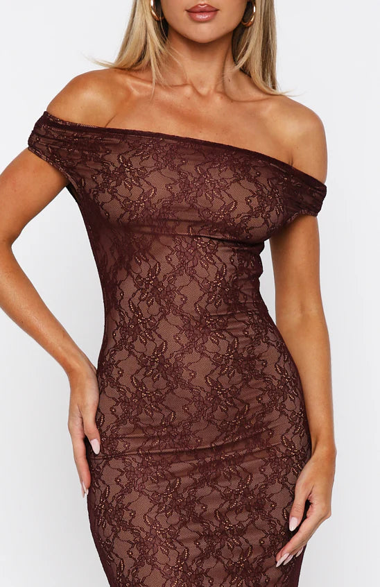 Float through the city of love in the Defied The Odds Off Shoulder Lace Maxi Dress Wine! Designed with an off-the-shoulder elastic neckline, a fitted bodice, and a flirty godet hem. Fully lined with high-stretch fabric and finished with a lace overlay. It’s the ideal canvas for minimalist heels and delicate jewellery, making it your perfect partner for an elegant soirée on the Champs‑Élysées.