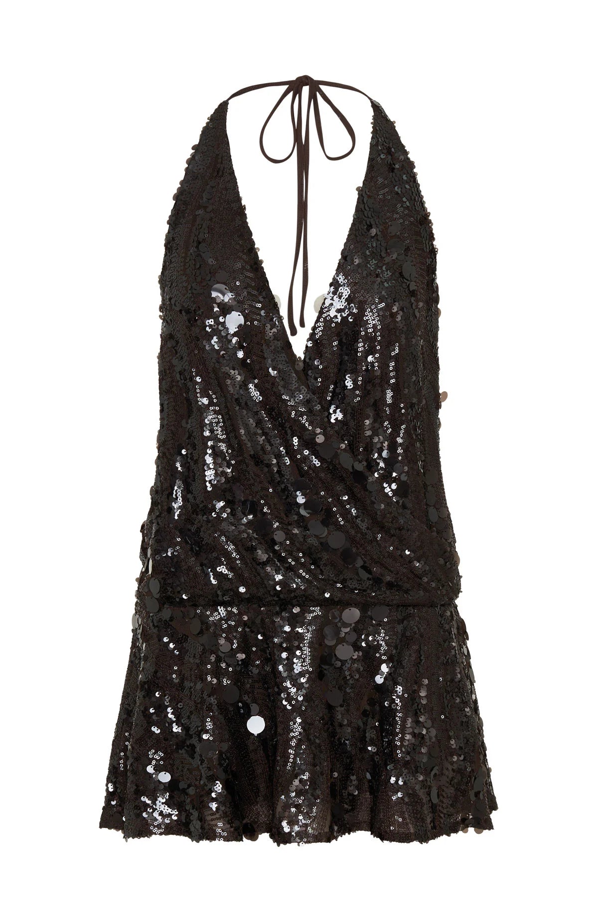 Made for moments that call for something a little extra. The Divine Excess Sequin Mini Dress in Chocolate features a halter neck design with self-tie straps, low plunge wrap over neckline, mesh-lined material, A-line skirt design, elasticated waistband, stretch material for an easy pull over design, and paillette sequin embellished material for a high shine look. Style with clear heels, simple gold jewellery and a statement shoulder bag for the perfect bday girl fit!