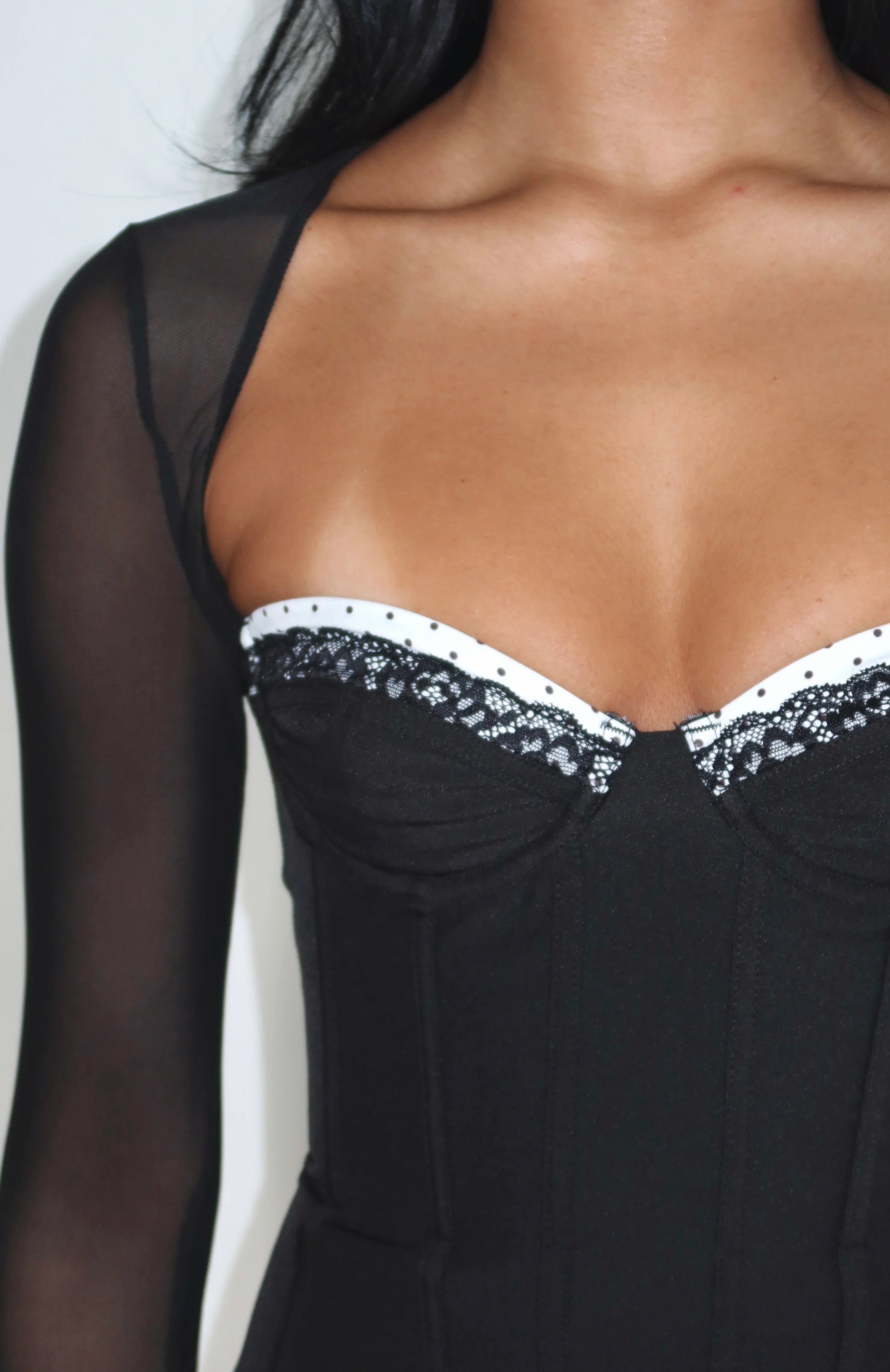 Date‑night perfection! the Get Into It Long Sleeve Mini in black features a sweetheart neckline with underwire bust cups trimmed in playful polka‑dots, sheer long sleeves, and structured boning down the bodice flowing into faux‑boning panels at the front. The fitted silhouette is fully lined, with an adjustable tie at the back and an invisible zipper plus hook‑and‑eye for a seamless finish. Complete the look with kitten heels and layered gold jewellery for the perfect sweet but sexy look.