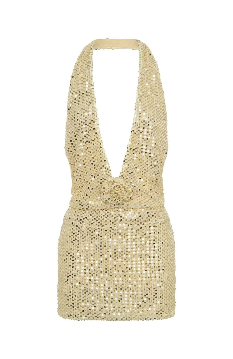 Shine in the spotlight with the Moonlit Vows Beaded Mini Dress in Cream! Featuring a fixed halter strap, a plunging neckline adorned with flower appliqué, and shimmering sequins and beads across the fabrication. Fully lined and backless for bold elegance. Style with a statement bag, sky‑high heels and sleek jewellery for your unforgettable night.