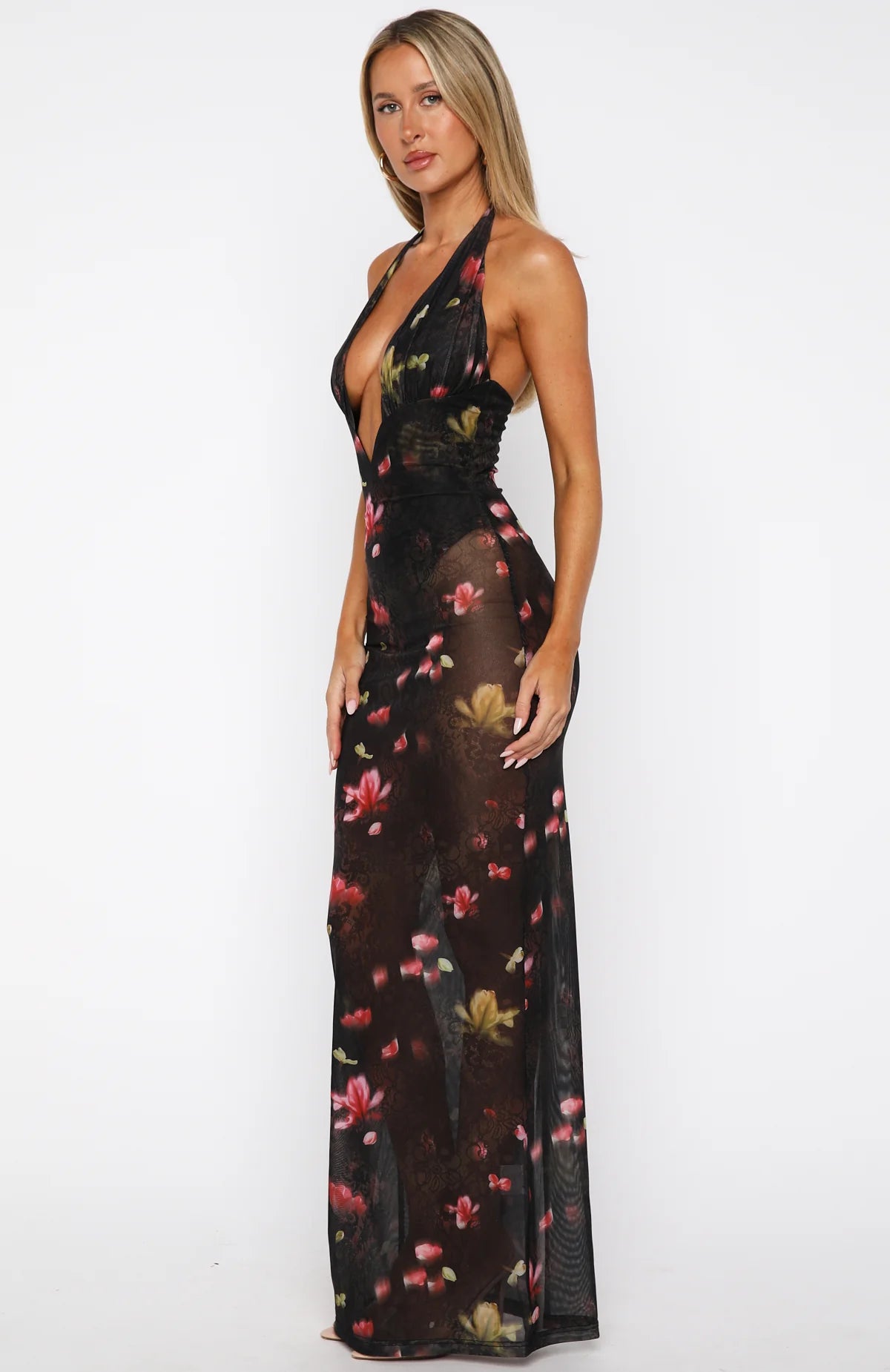 The I Only Wish Halter Maxi Dress Lace And Bloom is made for midnight mischief in Paris. It features halter straps and a plunging neckline over a sheer bust, backed by a bodysuit with hook‑and‑eye closure. The maxi length is sheer, with a back split, and an invisible zipper with a hook‑and‑eye ensures clean lines and confidence. Style with simple heels and gold jewellery for all eyes on you.