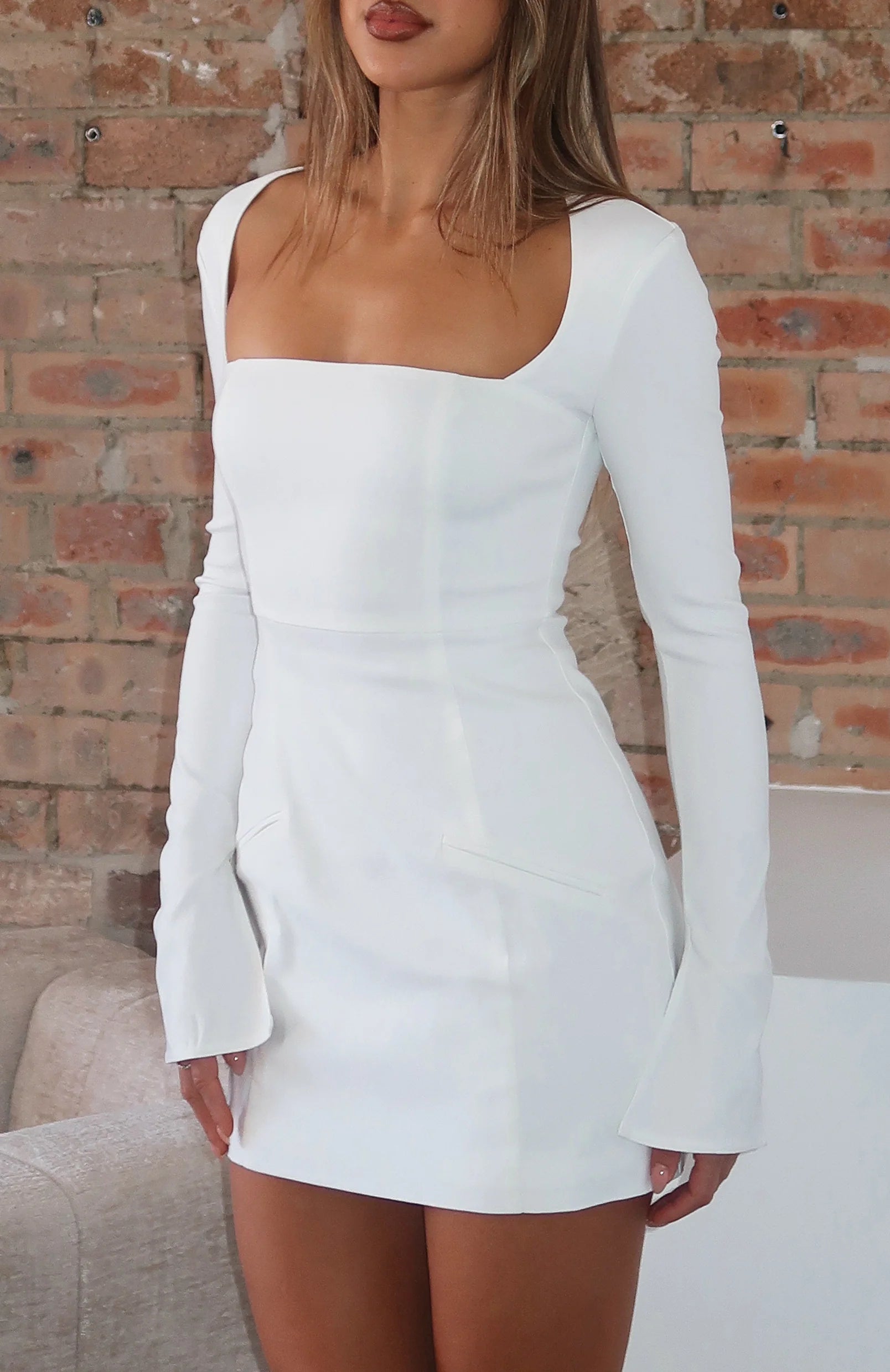 The Living For Love Long Sleeve Mini Dress in Off White combines timeless elegance with modern flair. Featuring a square neckline, flared long sleeves with split cuffs, and a fitted silhouette that flows into a flared skirt, this dress is both flattering and sophisticated. Designed with faux pockets and a fully lined interior, it ensures comfort and style. The back is finished with an invisible zipper and hook-and-eye closure for a seamless look. Pair it with kitten heels and simple gold jewellery to complete a chic ensemble.
