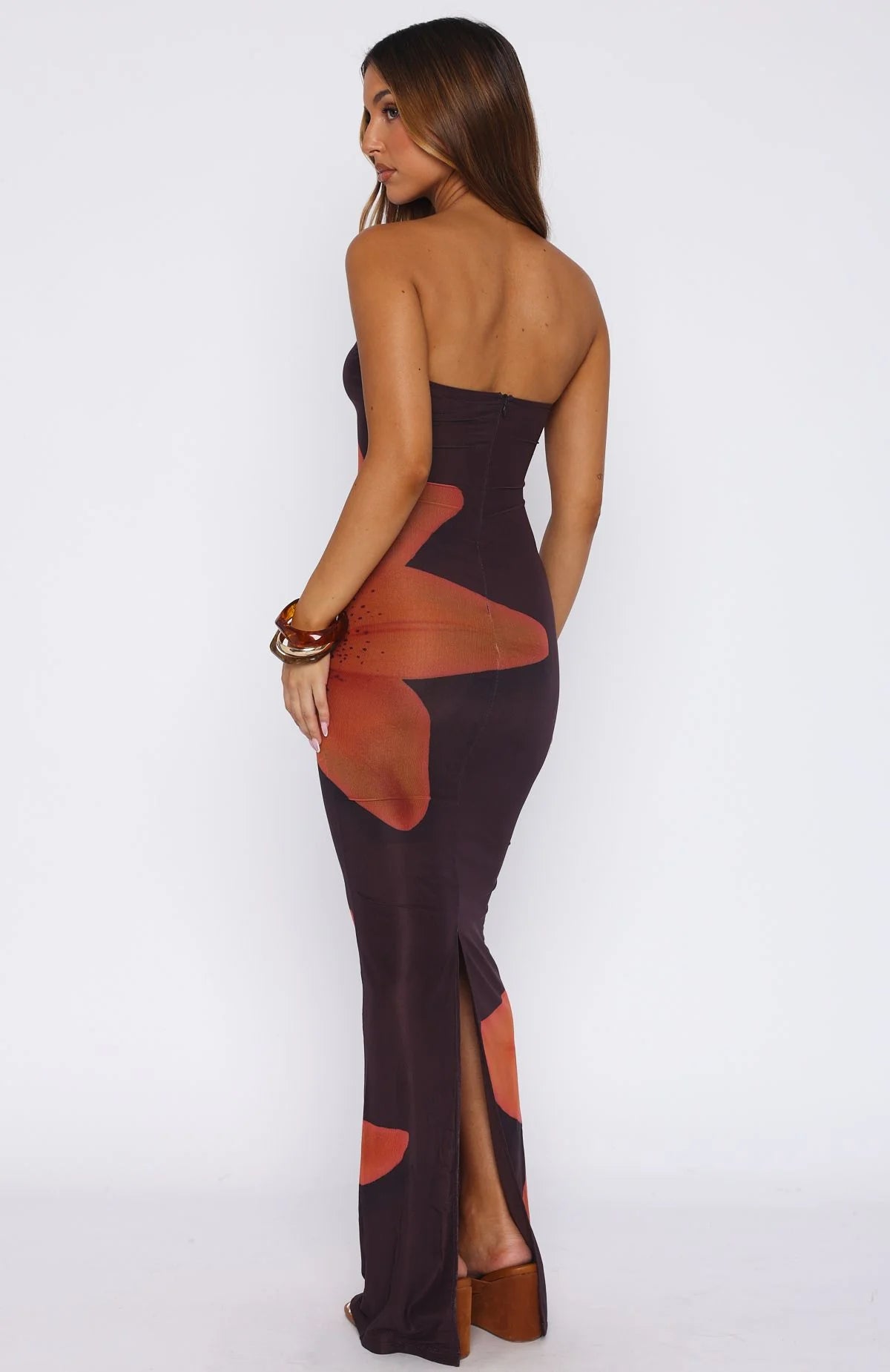 Set the standard in the On A Trip Maxi Dress Tangerine Twist. Features a strapless design with gel grip on bust, back invisible zipper and clasp closure, mesh lined, semi-sheer, maxi length and back split detailing. Let the dress do all the talking and pair with perspex heels and gold accessories!