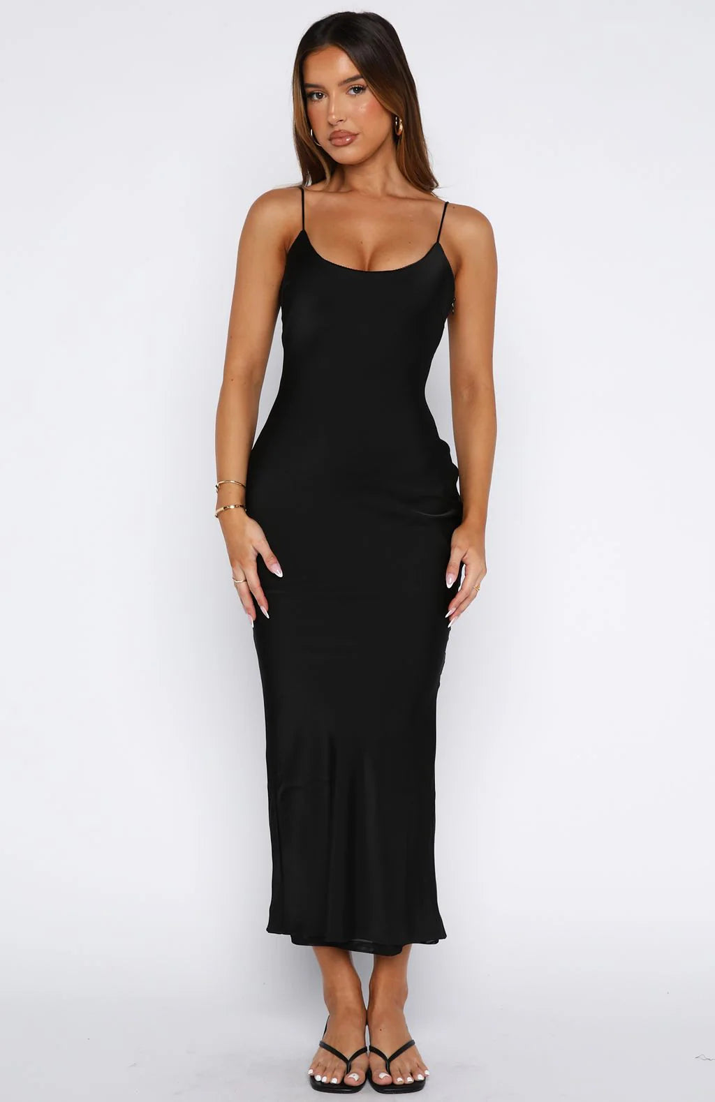 Timeless and elegant is our She's For Keeps Maxi Dress in Black! Features adjustable spaghetti straps, scoop neckline with feminine lace trim detailing, invisible zipper with hook and eye closure on side and lined. Effortlessly slip on kitten heels and dainty gold jewellery for a chic old money look!