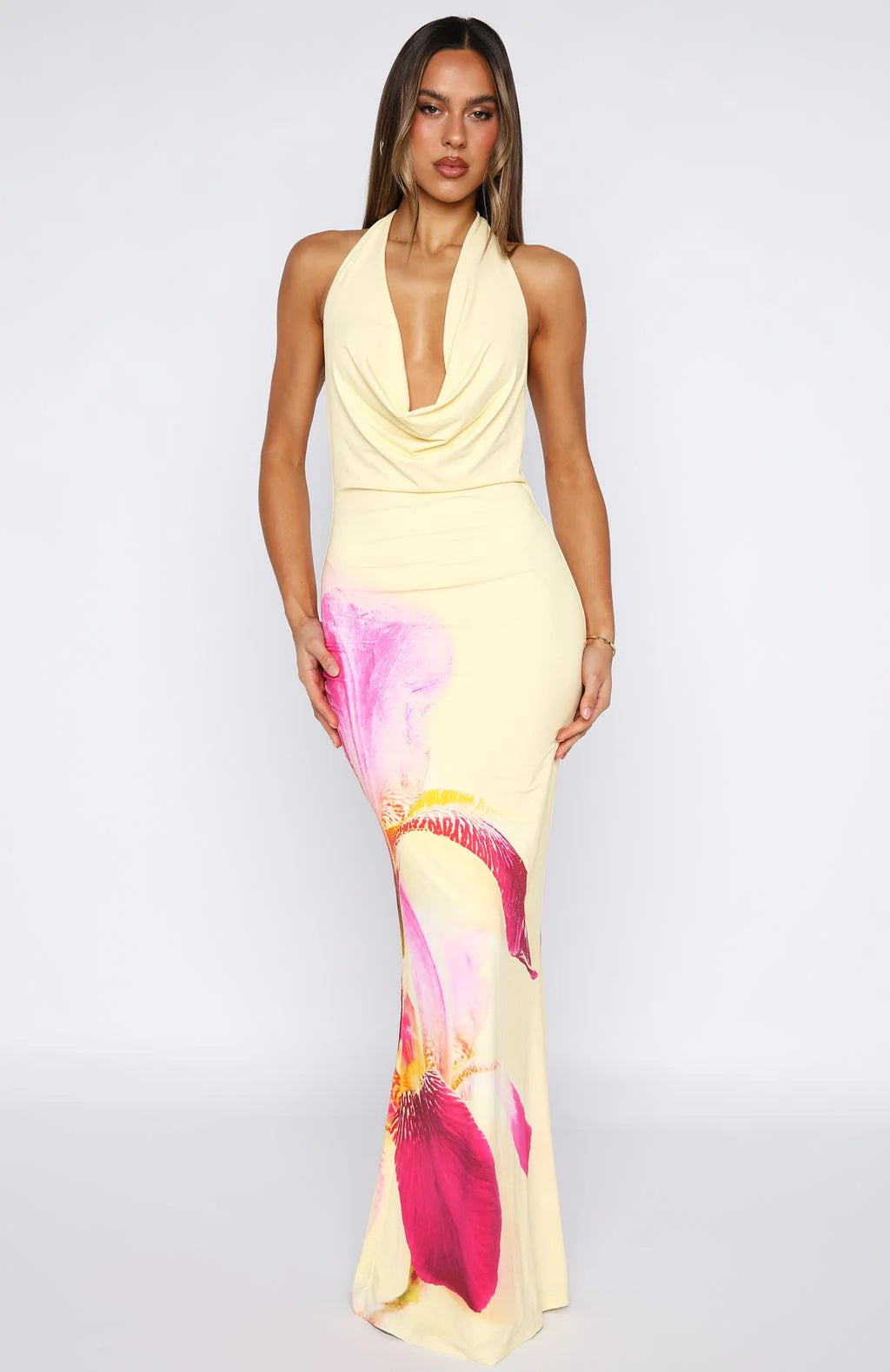 This head-turning dress features a sensual cowl neckline, halter straps that tie at the back, sheer lining, and an elegant backless design. Its floor-grazing maxi length paired with the dreamy printed fabric ensures you’ll shine at any summer soiree. Style with kitten heels and layered gold jewellery to let the dress do all the talking!